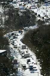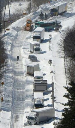 かろうじて1車線分だけ除雪されているが、その部分でも、トラックでは登れないくらいの積雪。行き場を失ったやつが無理矢理登って来て、せっかく確保されてる1車線を潰すw