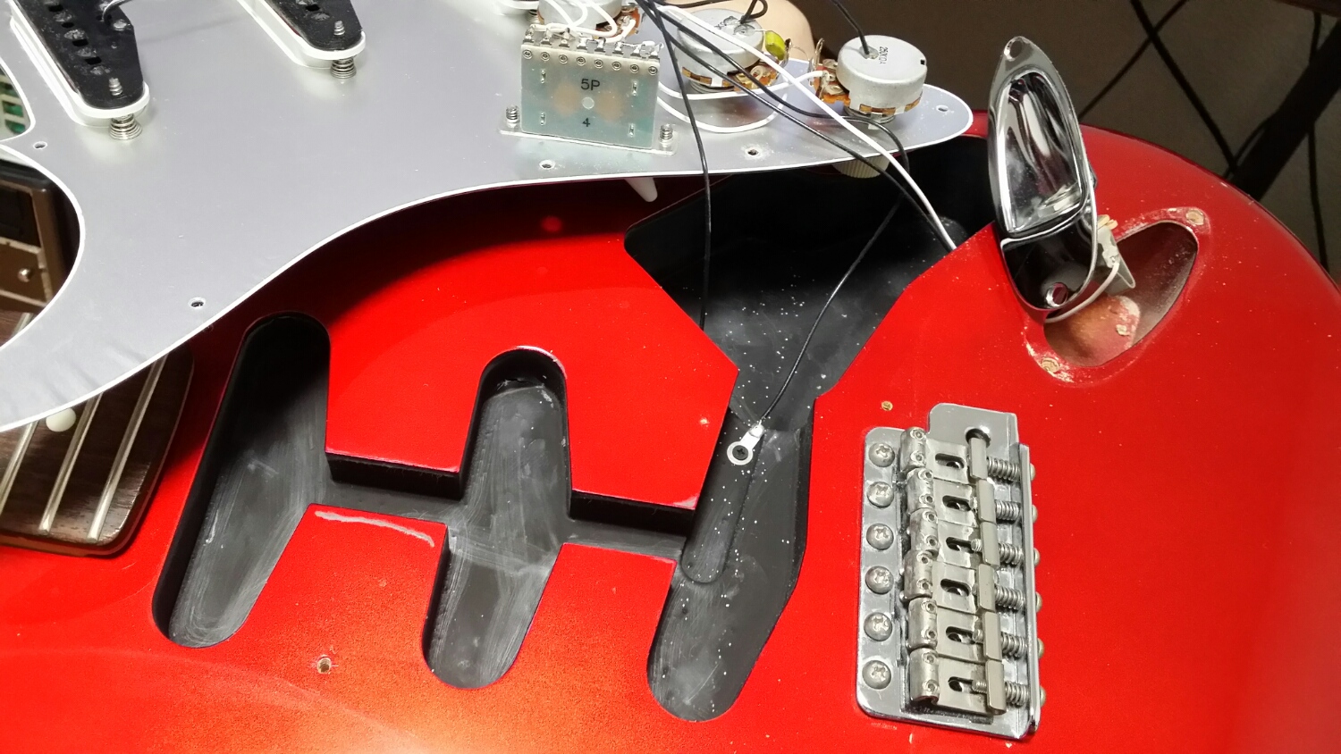 そんな価格帯のギターでキャビティに導電塗料、PG裏全面アルミ箔貼り。
