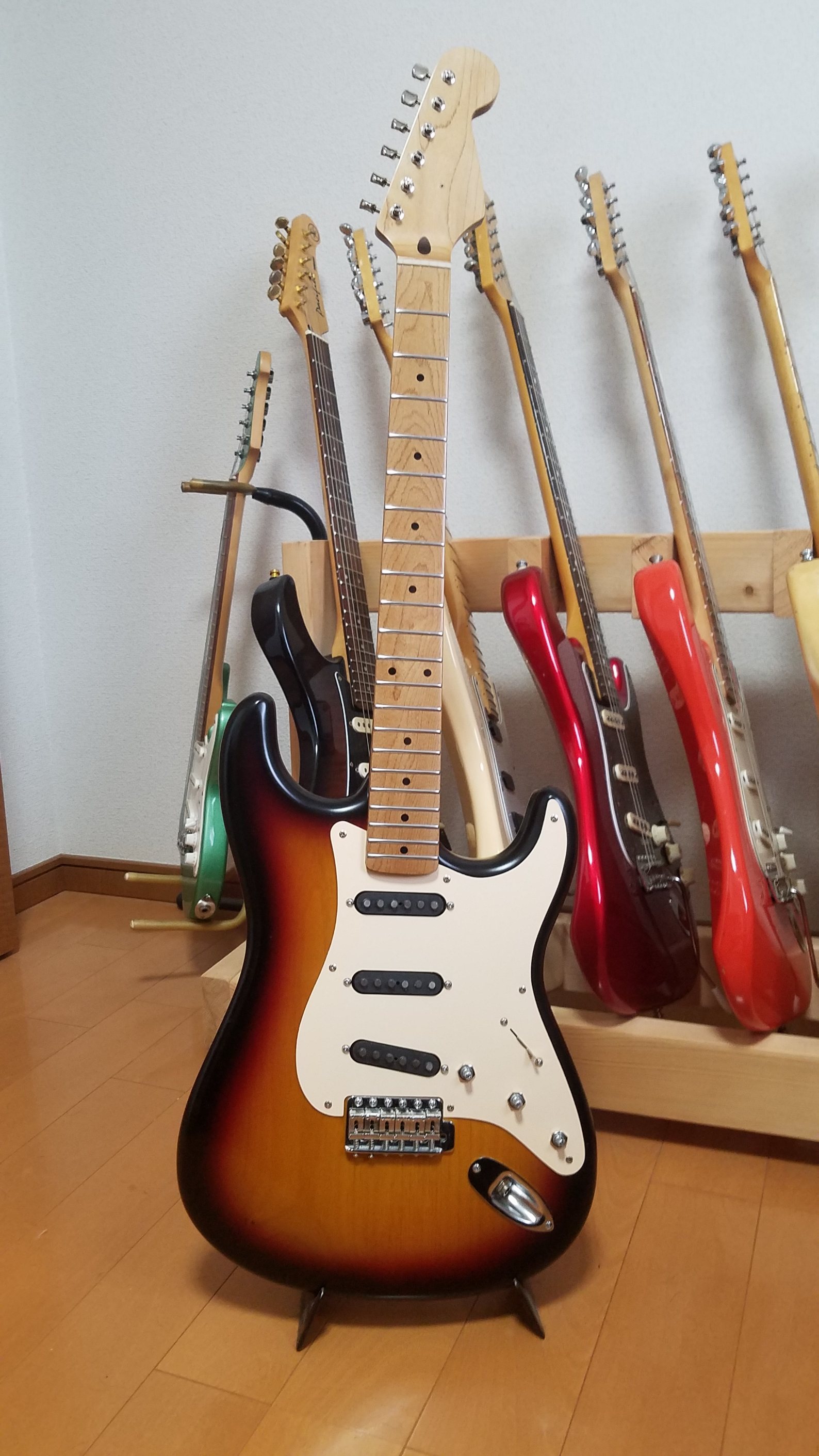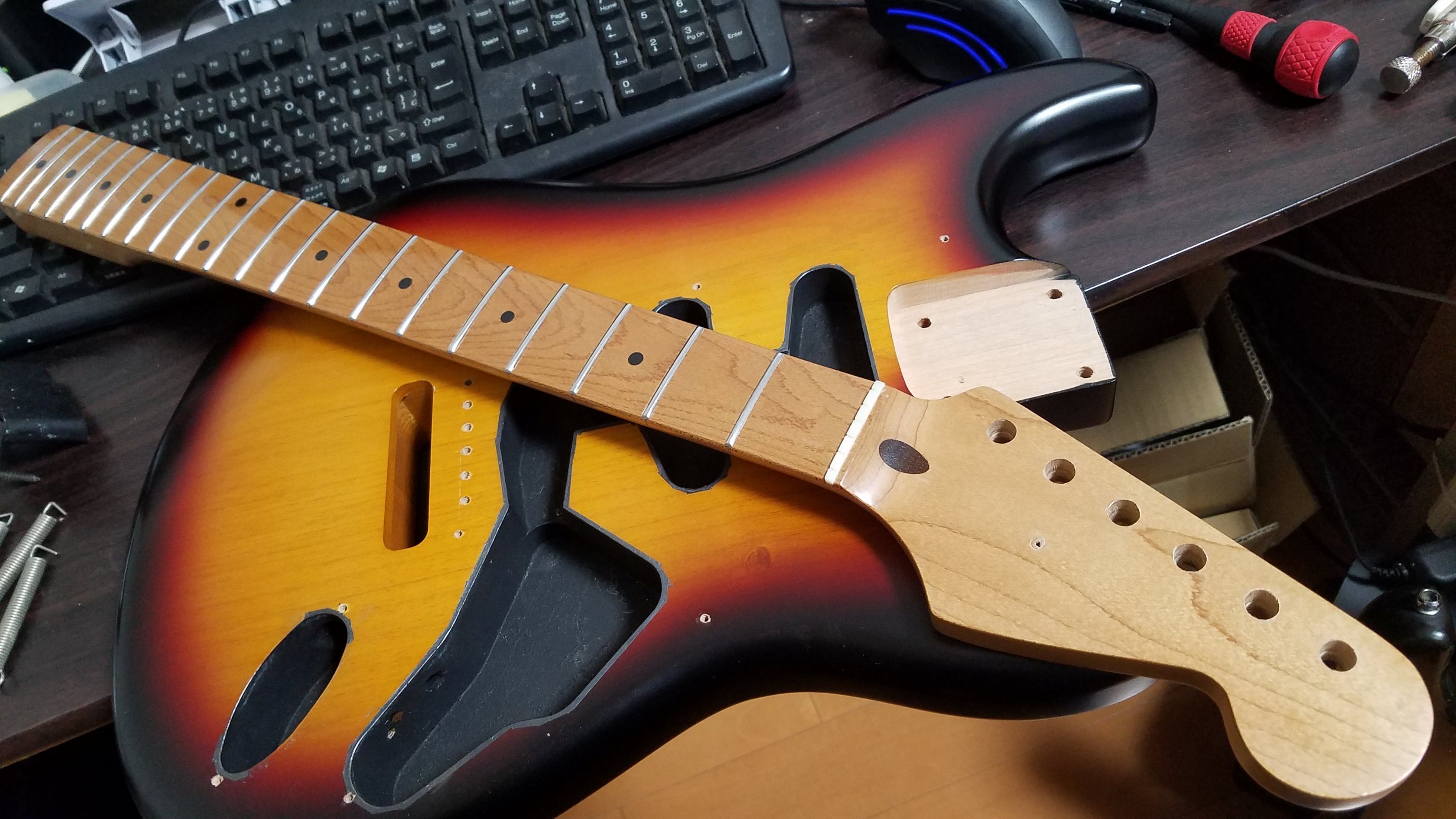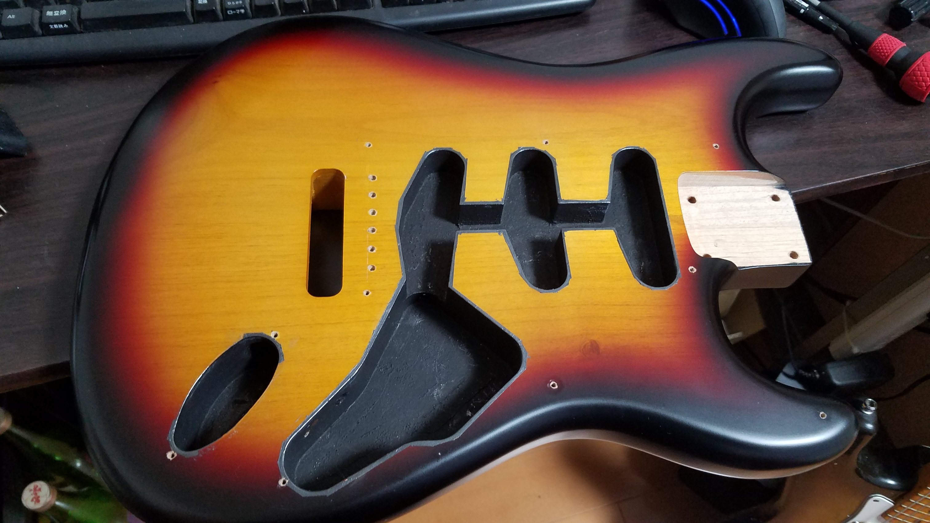 ボディ3,000円ネック2,000円だったかな?キャビティ加工もキレイだし、スタッドピッチは国産規格56mmぽいし、ネックもヘッド形状やらラディアスやら安ギターぽくはないし。