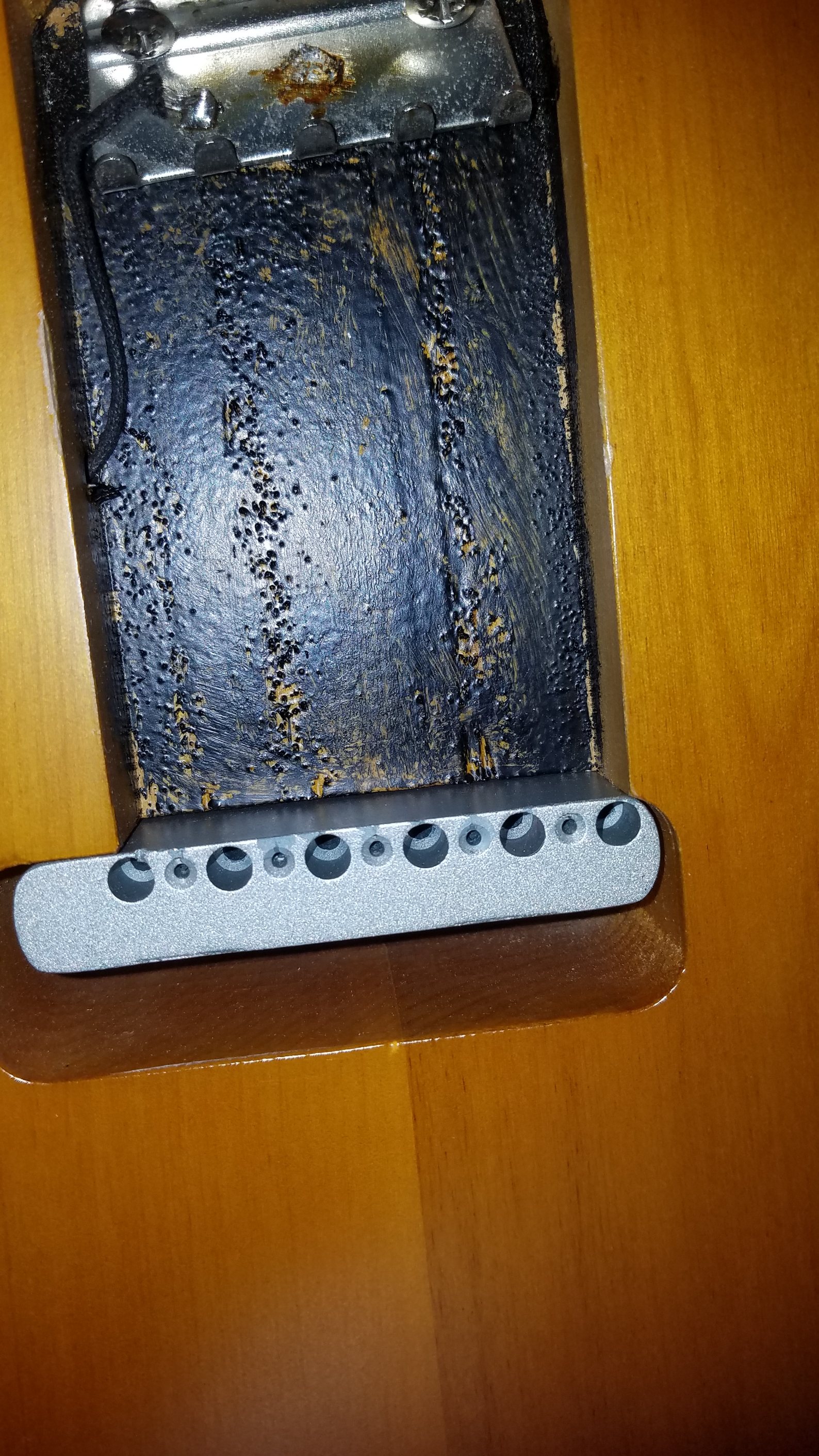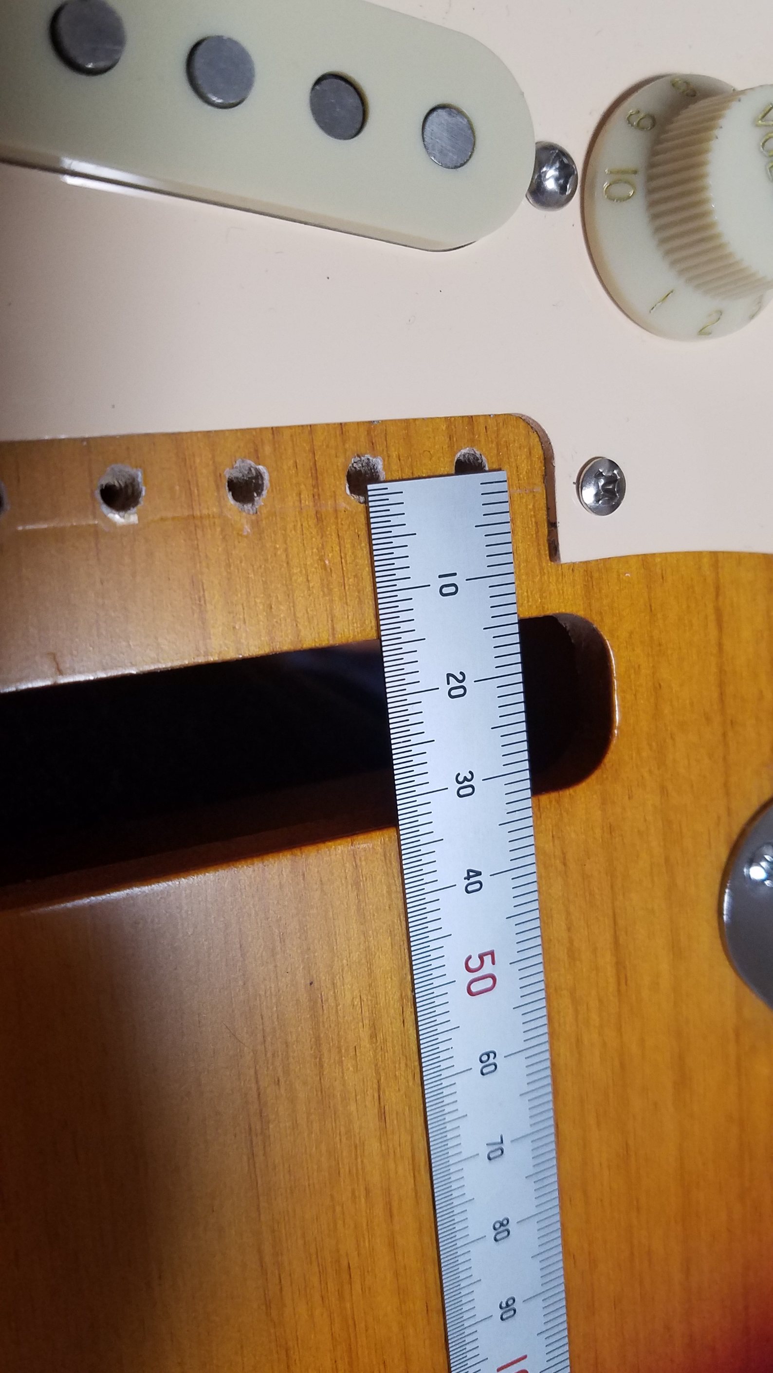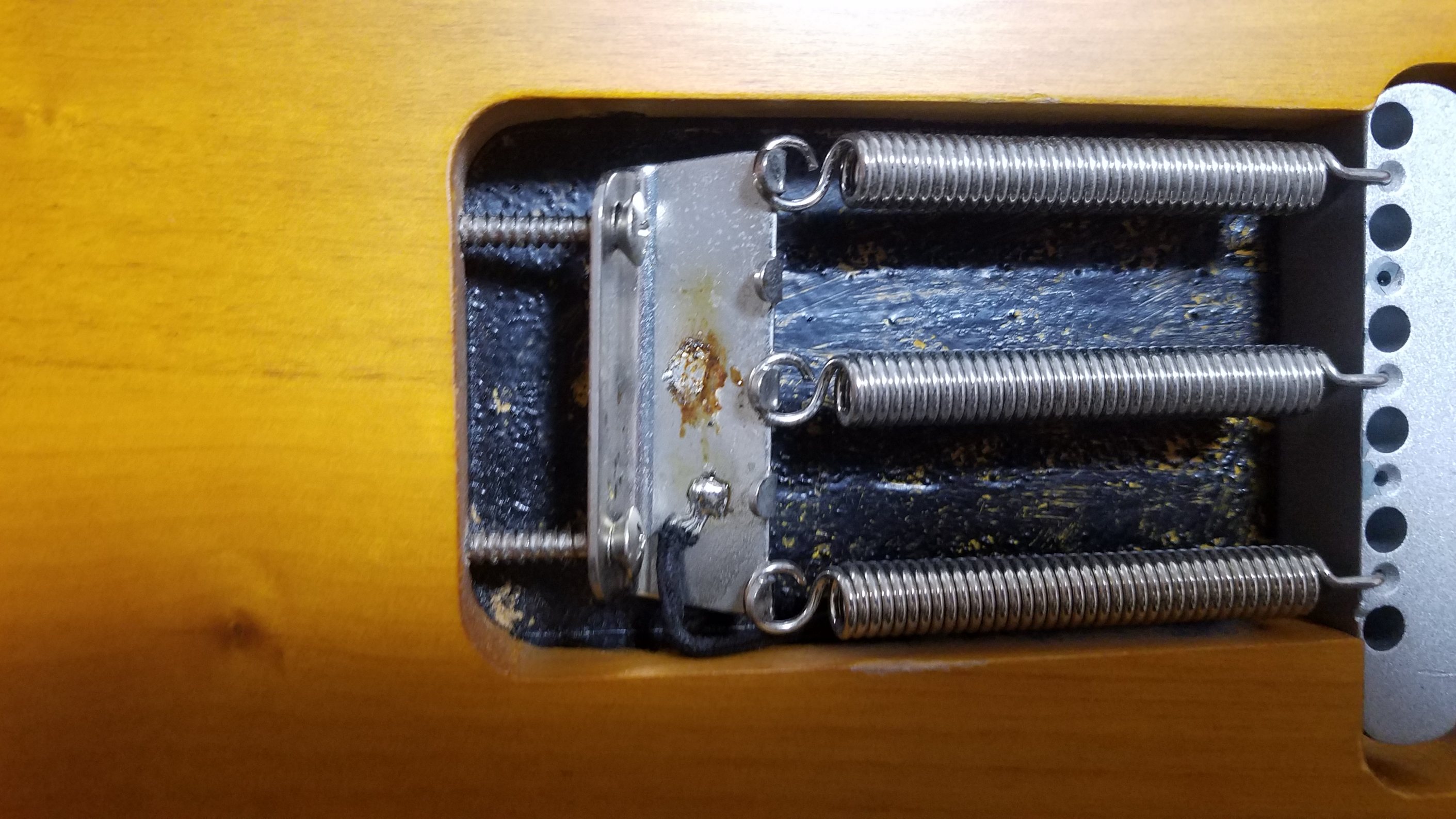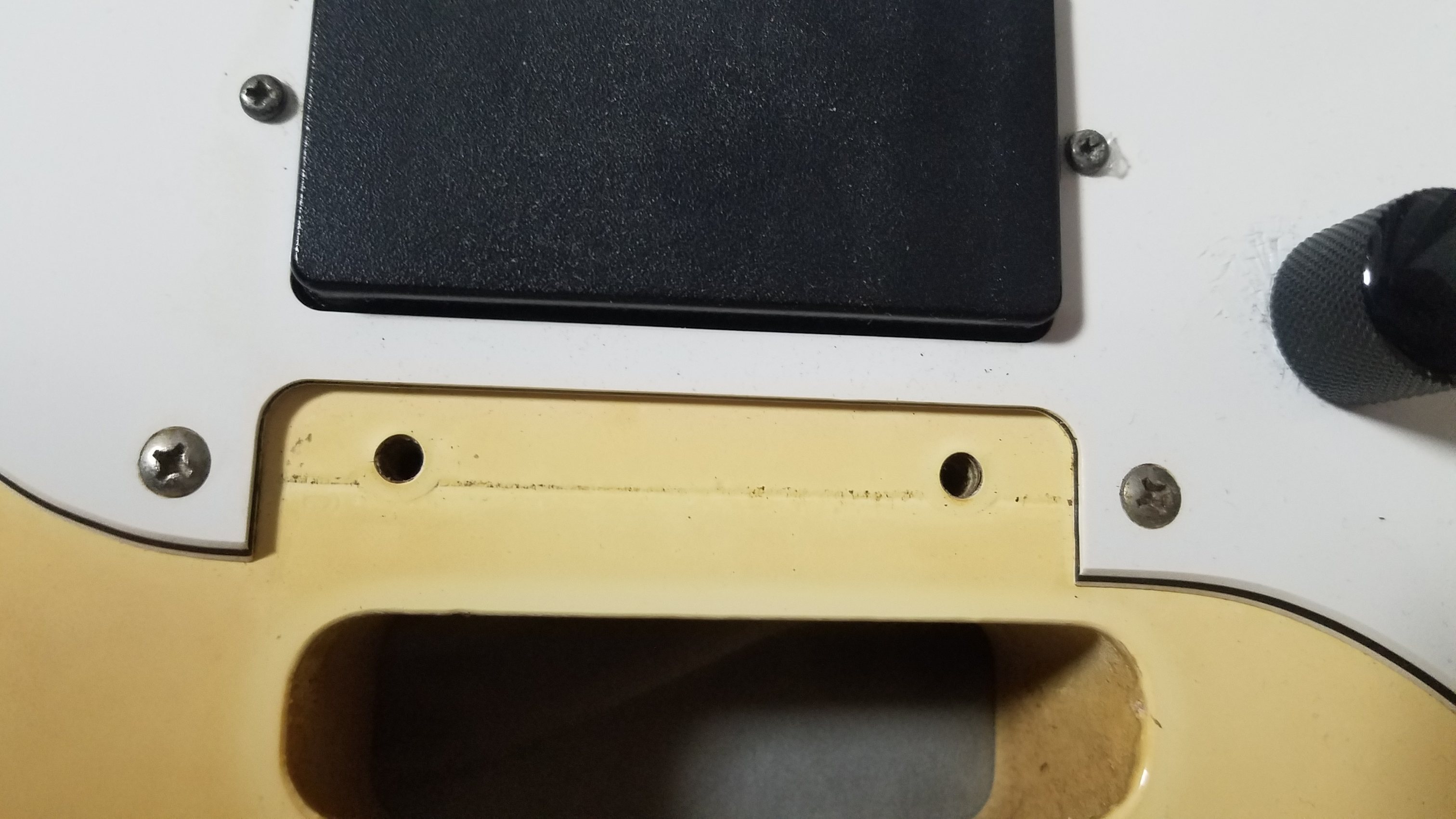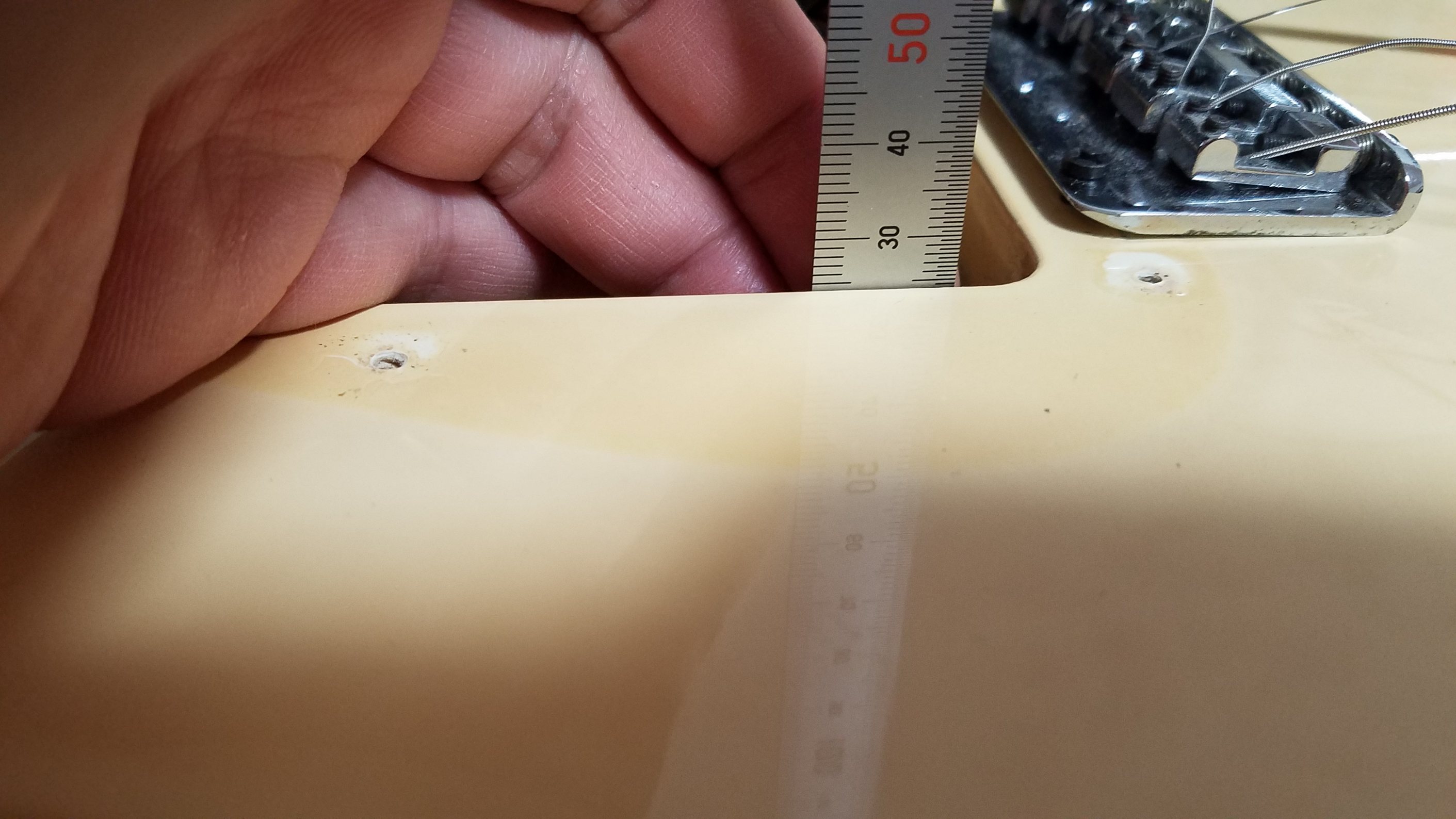 リアにハムバッカーが載っていたり、このギターのように弁当箱キャビティである場合、スタッドを受け止める木部は相当薄くなり、フロイドタイプなら更にスタッド位置が前方になる。