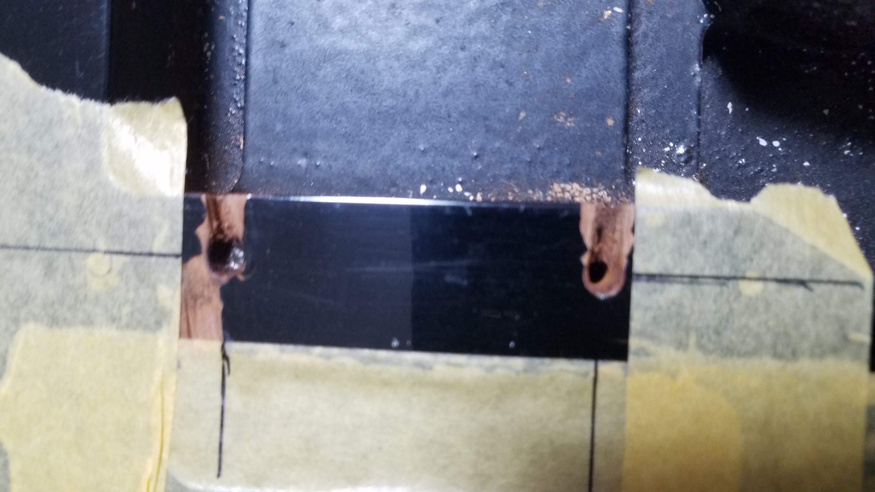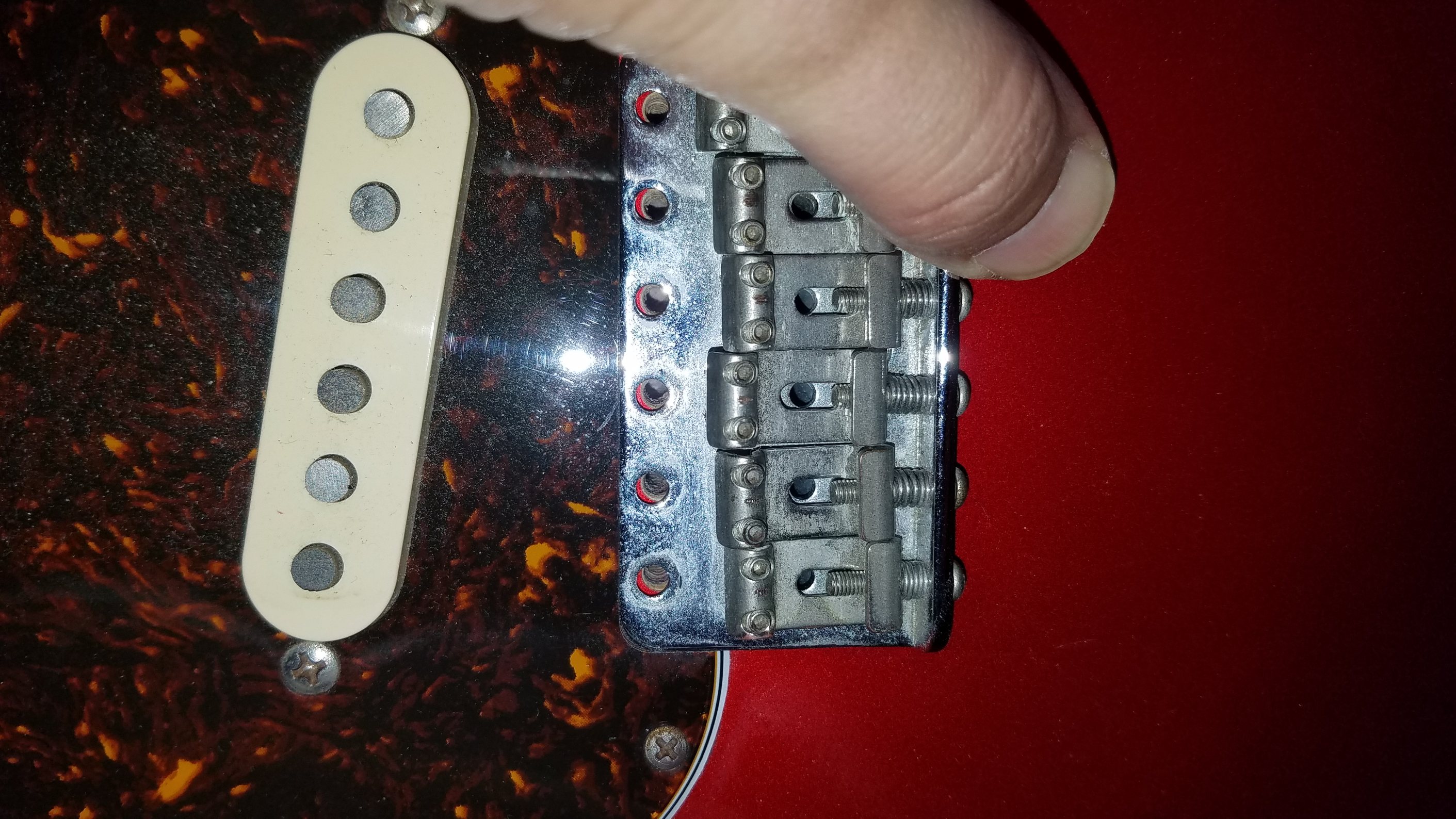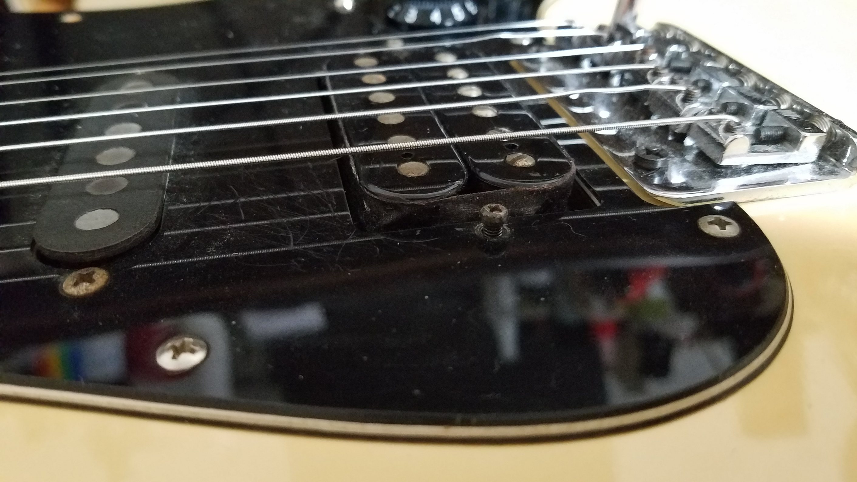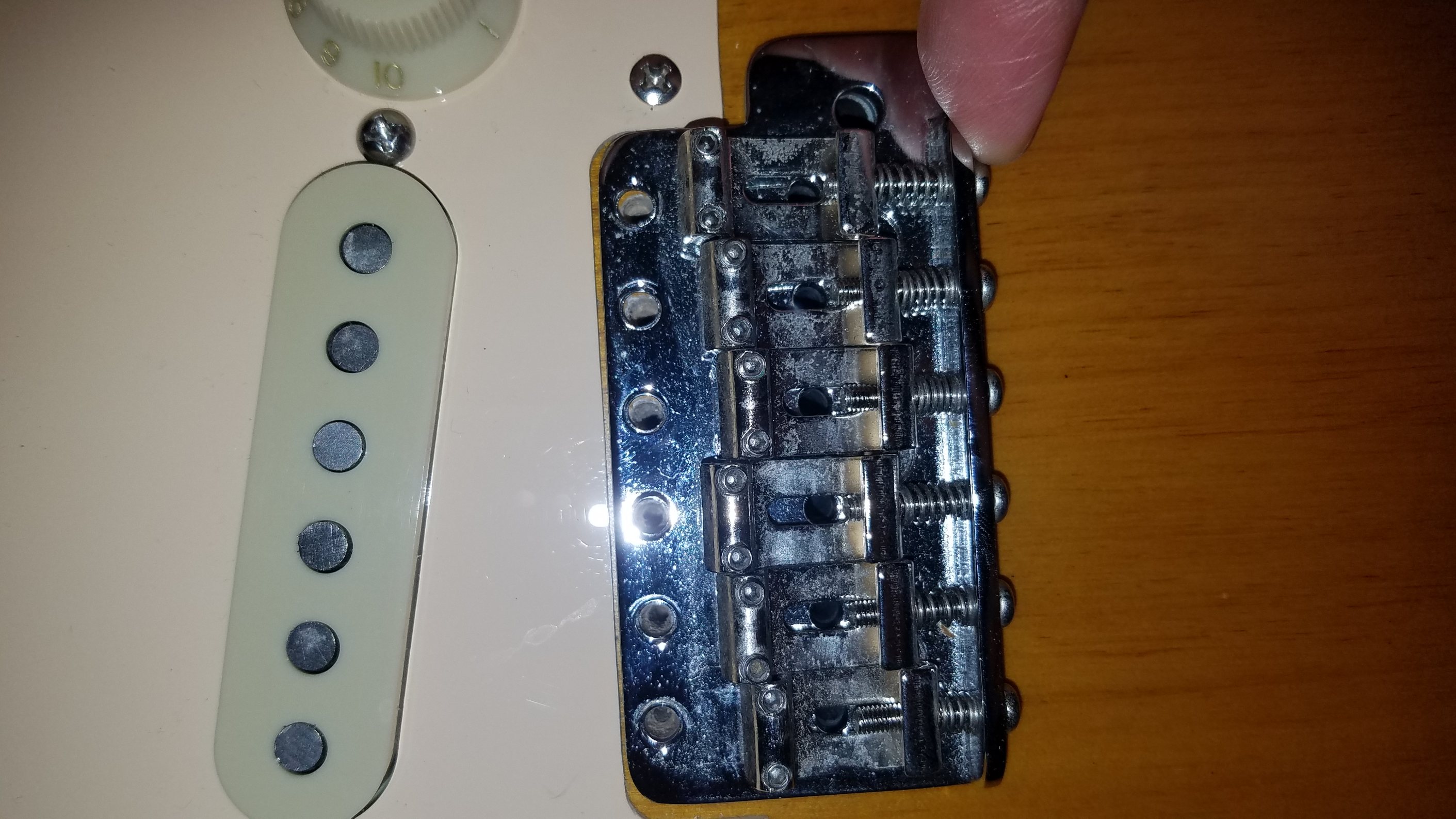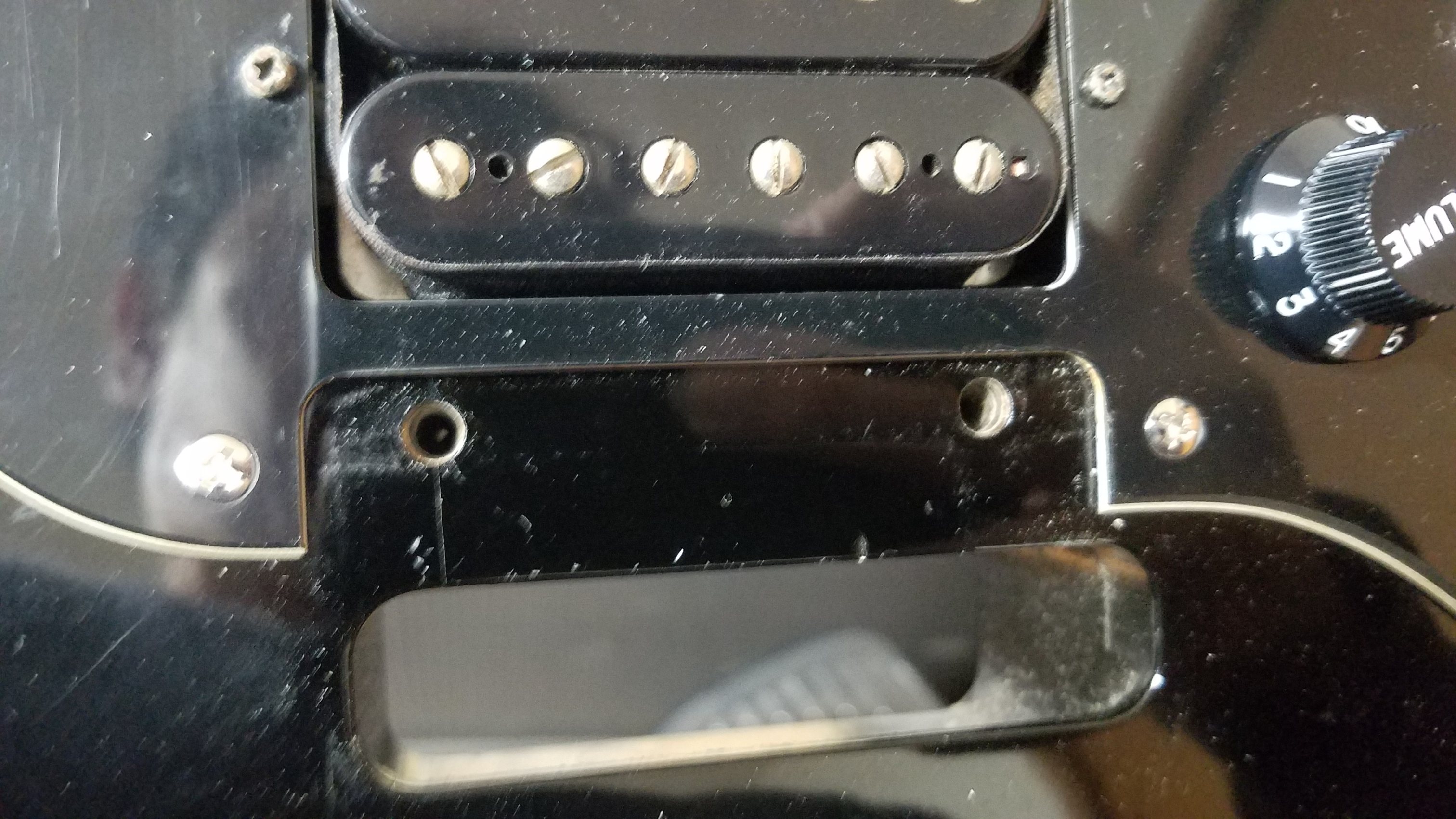 リアにハムバッカーが載っていたり、このギターのように弁当箱キャビティである場合、スタッドを受け止める木部は相当薄くなり、フロイドタイプなら更にスタッド位置が前方になる。