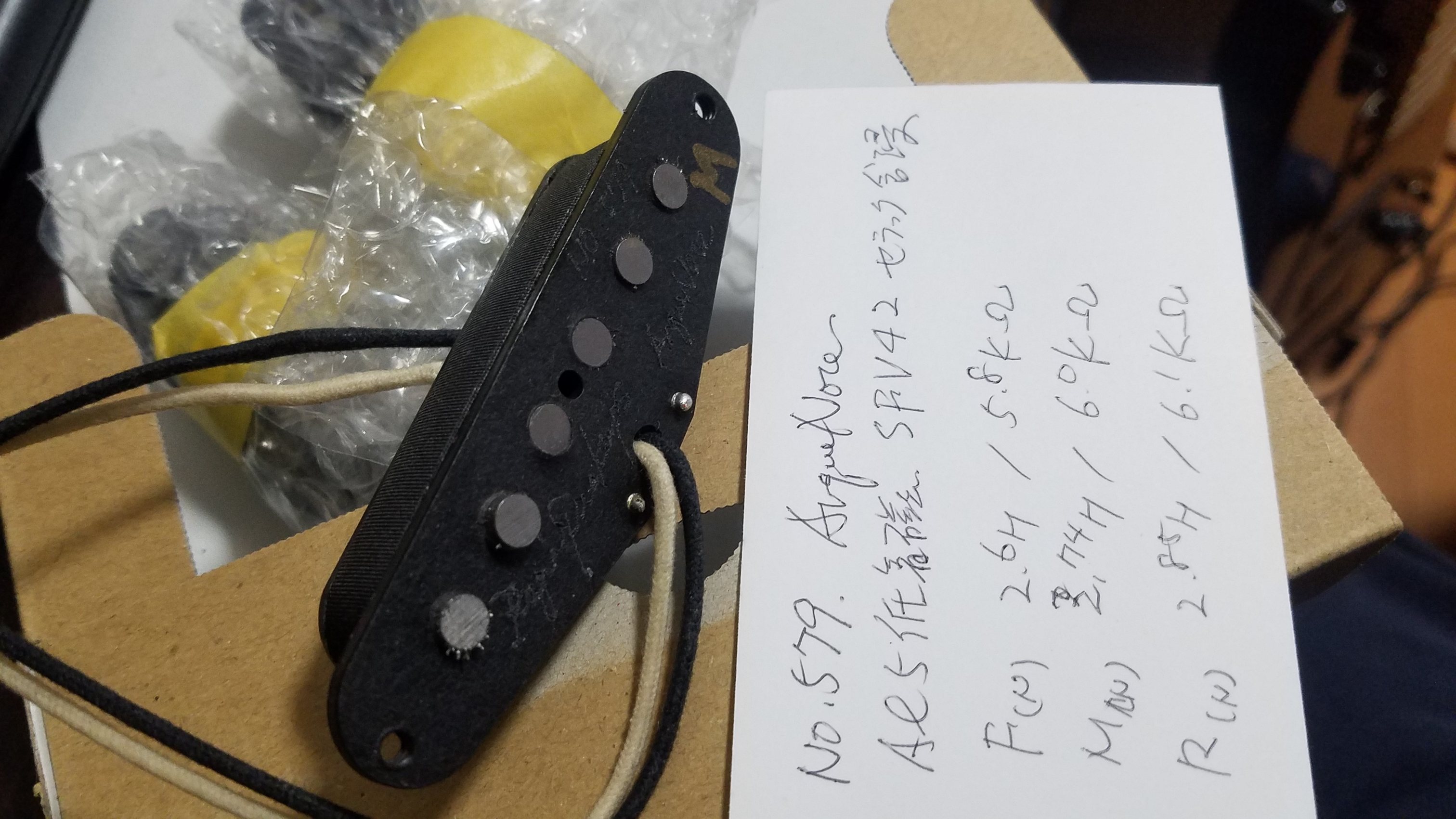 このモデルはセンターも正磁正相(Non-RWRP)で、マグネットはアルニコ5だが低着磁、いかにも手作りな感じが好印象な梱包に、手書きでシリアルと仕様、それぞれのインダクタンスとキャパシタンス計測値を記した(手巻きなので数値が製品ごとに微細に変わる)カードを入れてくれる。なんとも素敵なピックアップだ。