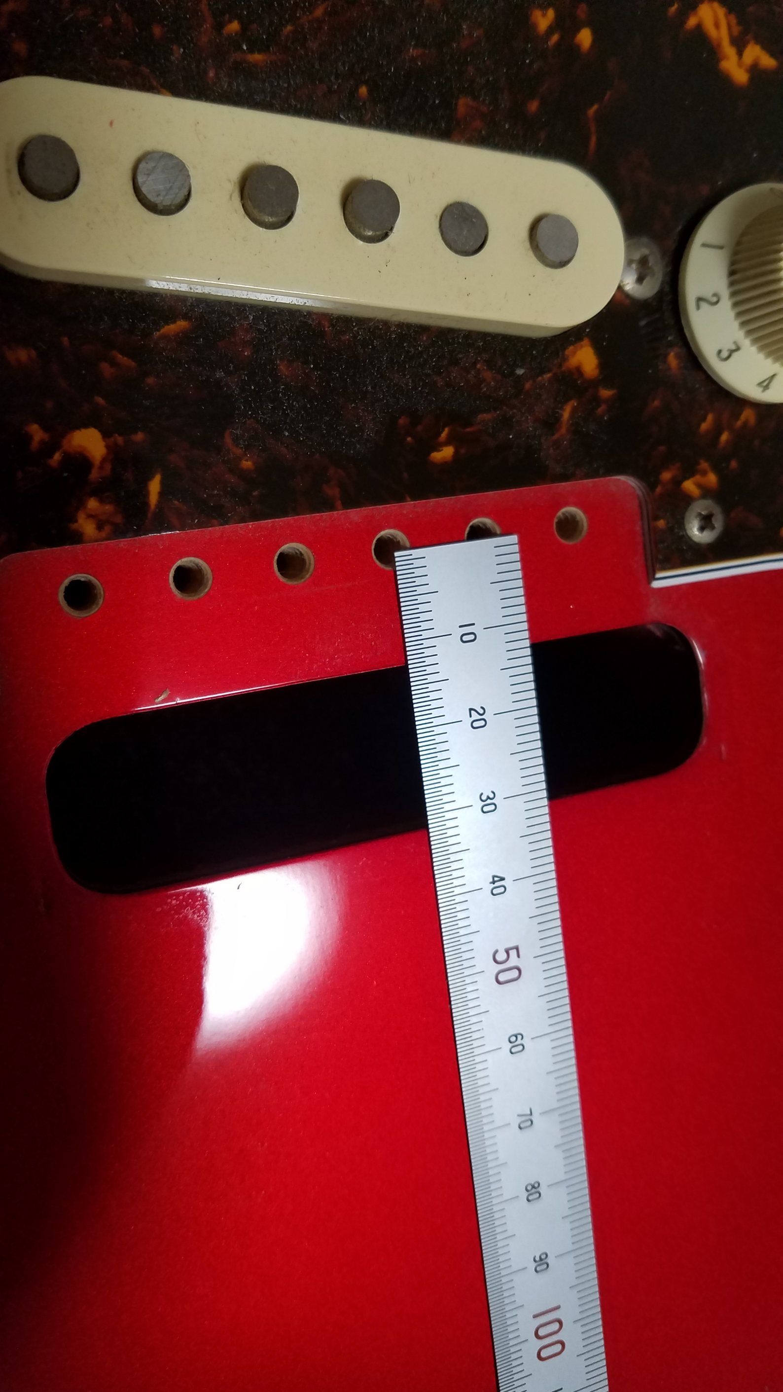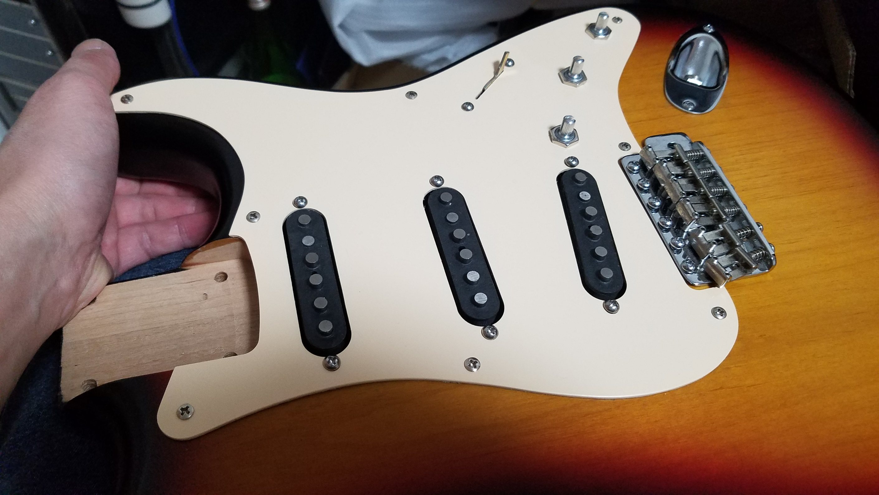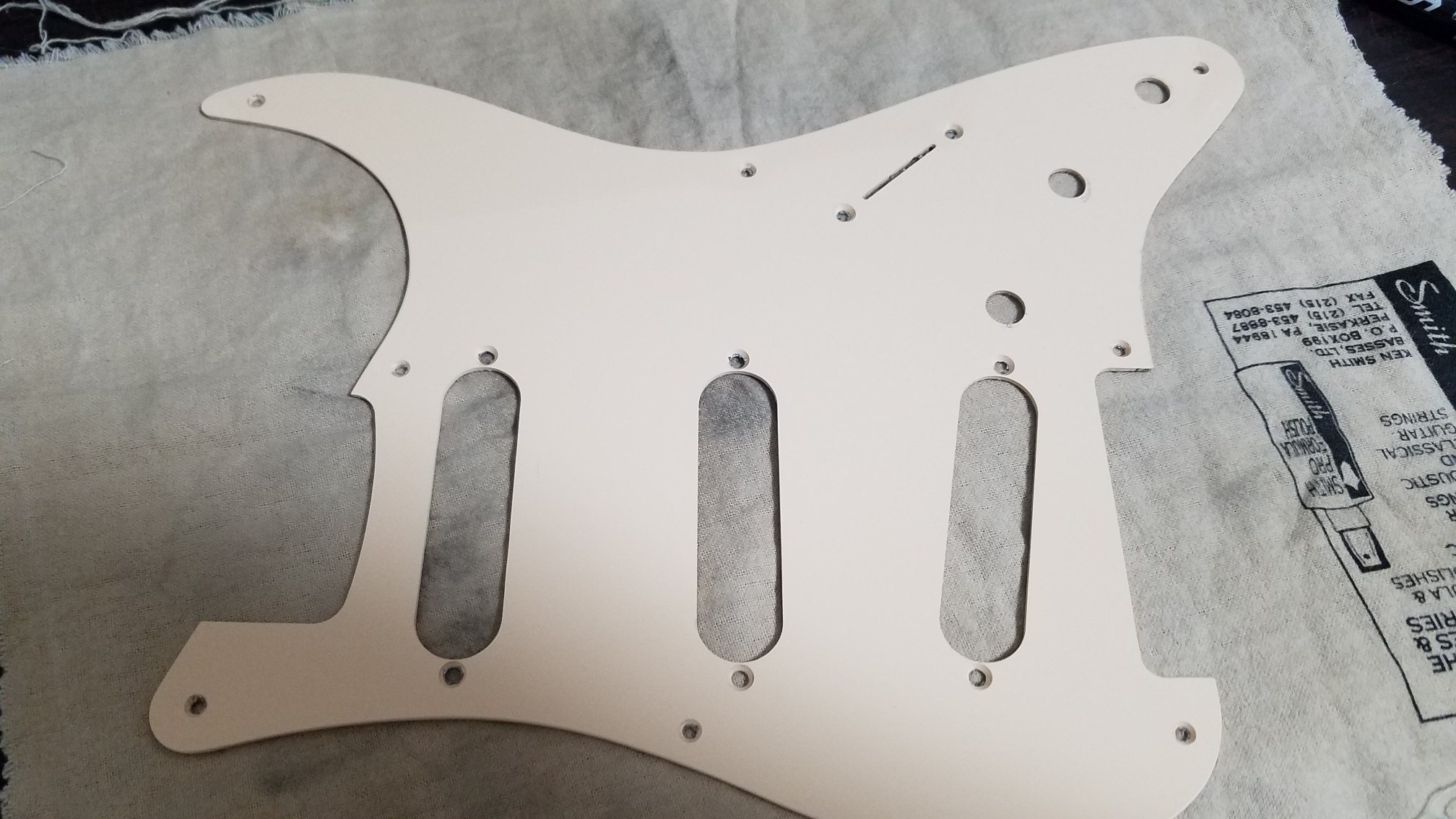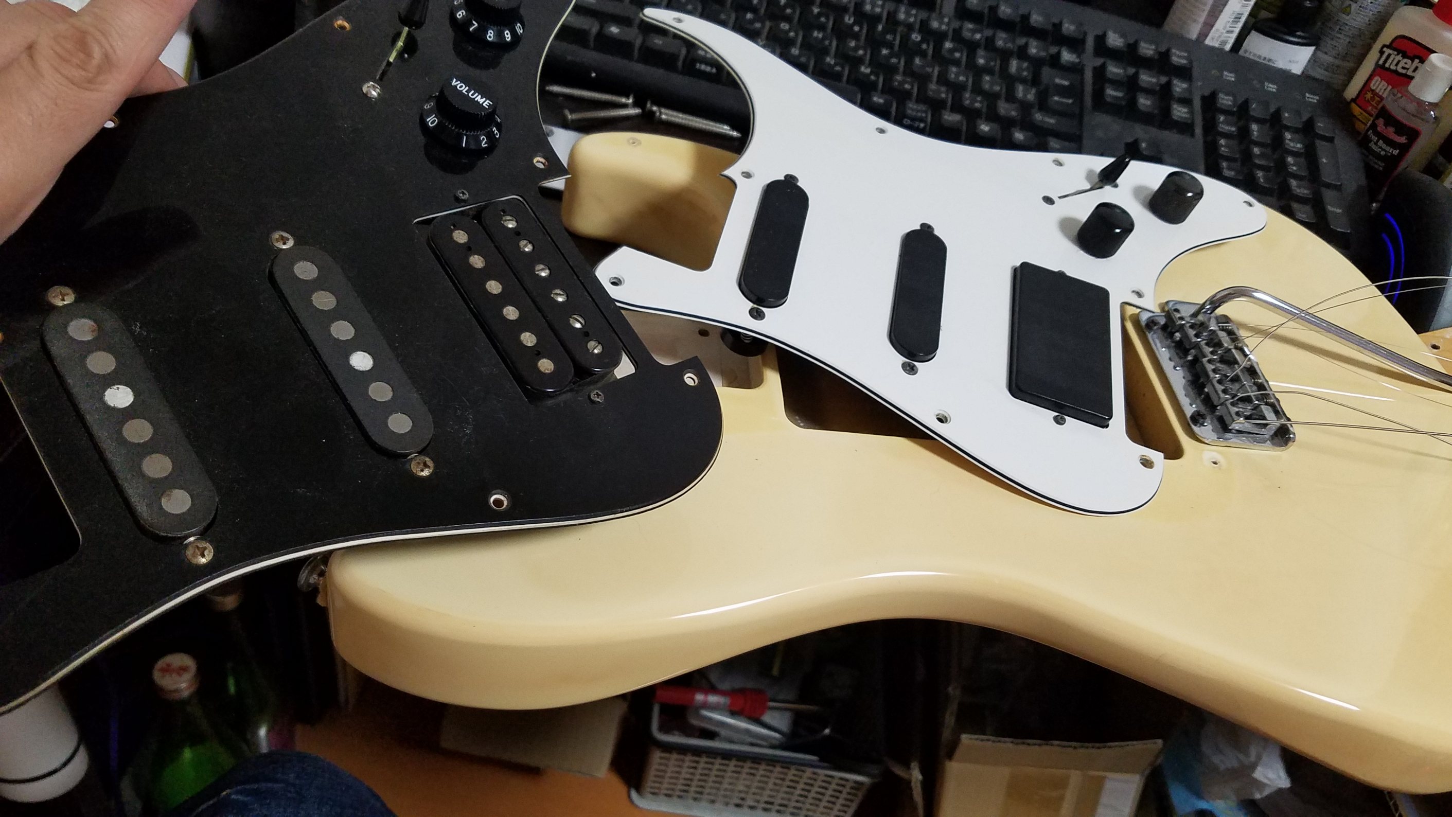 ピックガードはアイボリーの1プライだった。3トーンバーストのメイプルネック、さしずめ'58あたりの見た目になる感じか。セット販売ではなく別々に入手したネック/ボディなんだろうし、確かにネックエンドの加工が少し合わず隙間が空く。スケールラインはきちんと出たんだろうか?などと一抹の不安はある。