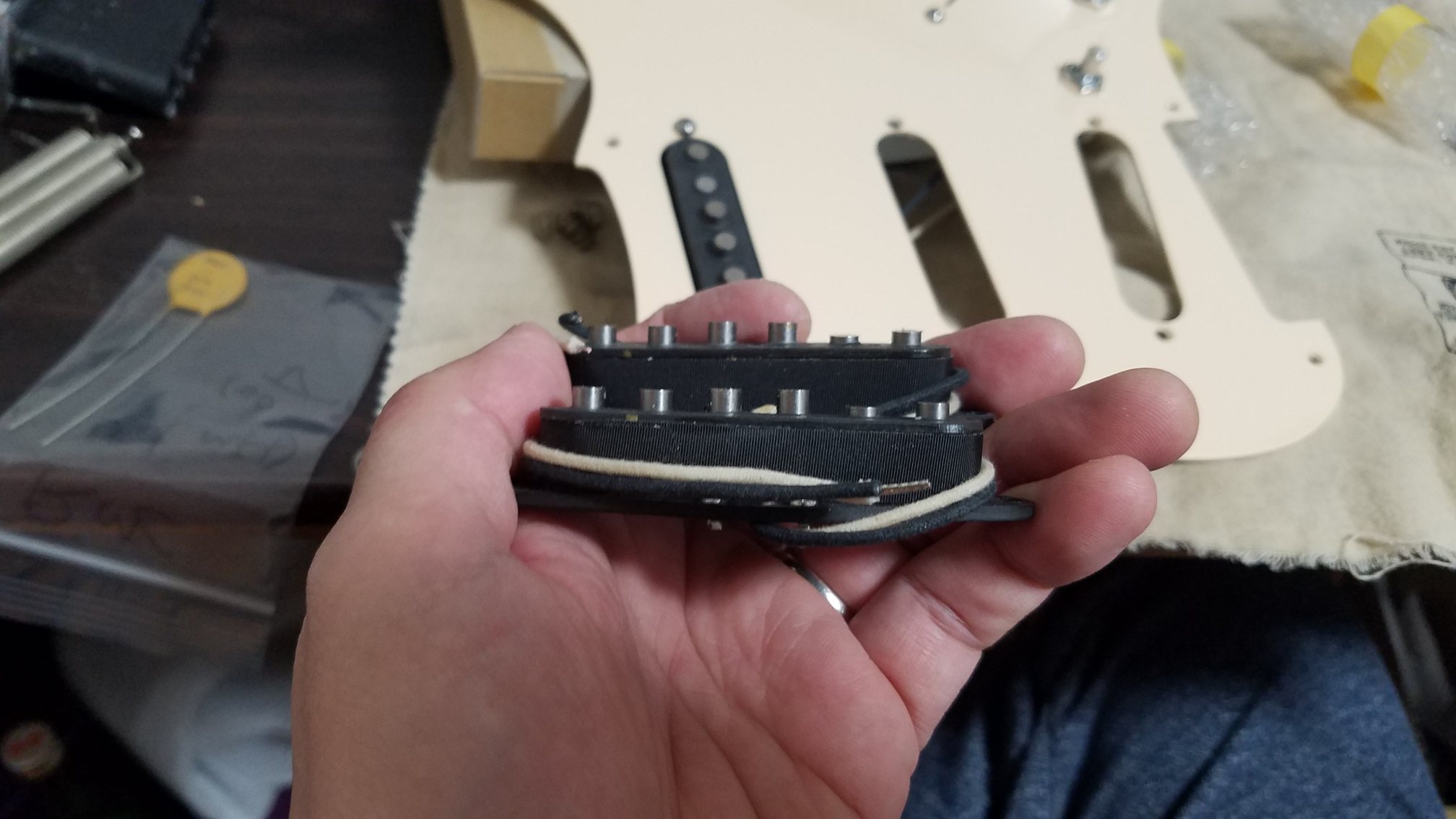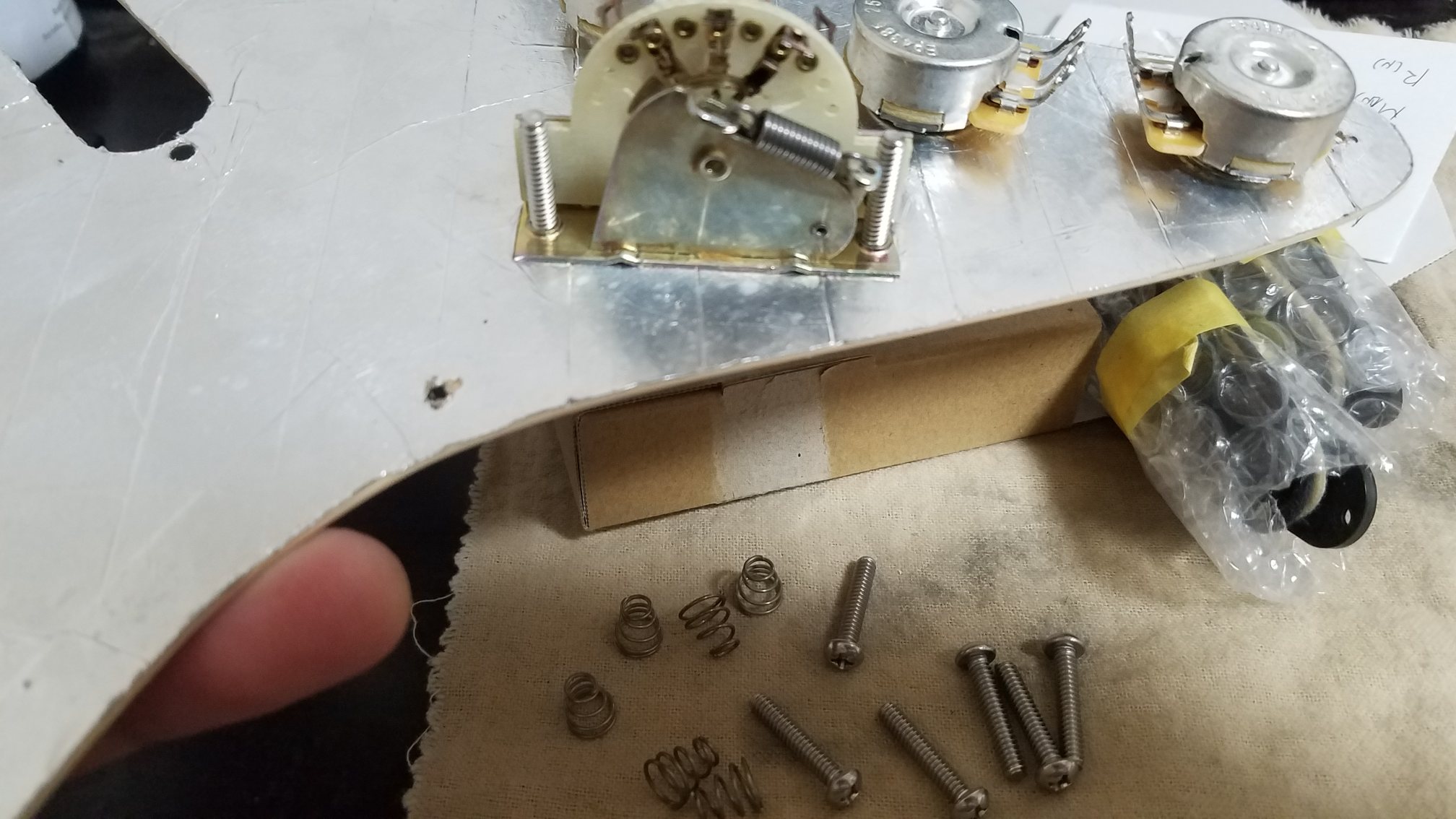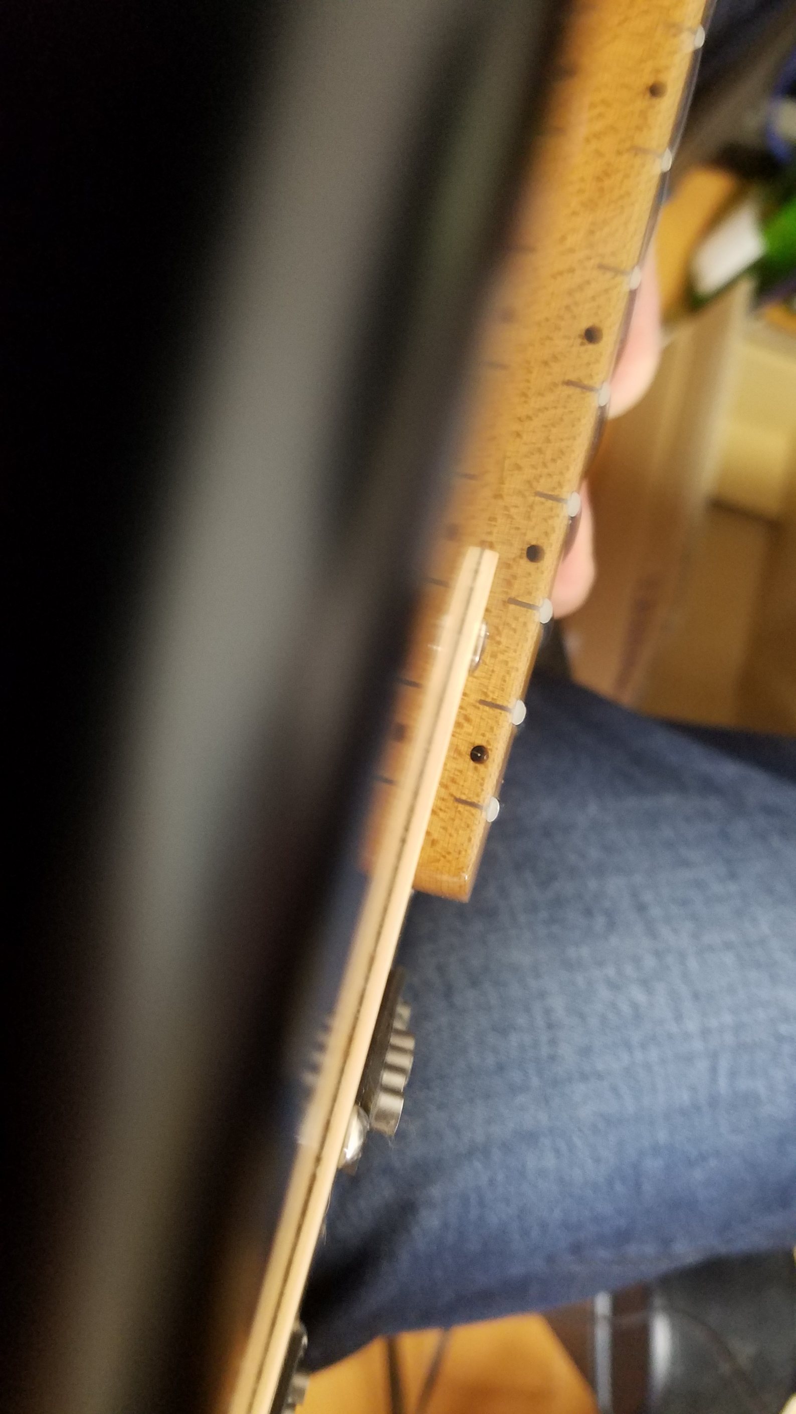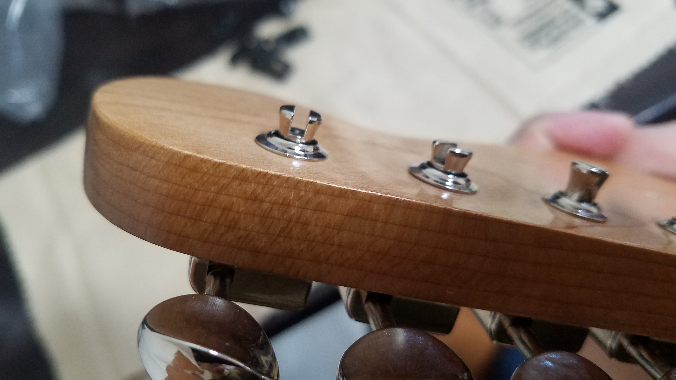 ピックガードはアイボリーの1プライだった。3トーンバーストのメイプルネック、さしずめ'58あたりの見た目になる感じか。セット販売ではなく別々に入手したネック/ボディなんだろうし、確かにネックエンドの加工が少し合わず隙間が空く。スケールラインはきちんと出たんだろうか?などと一抹の不安はある。