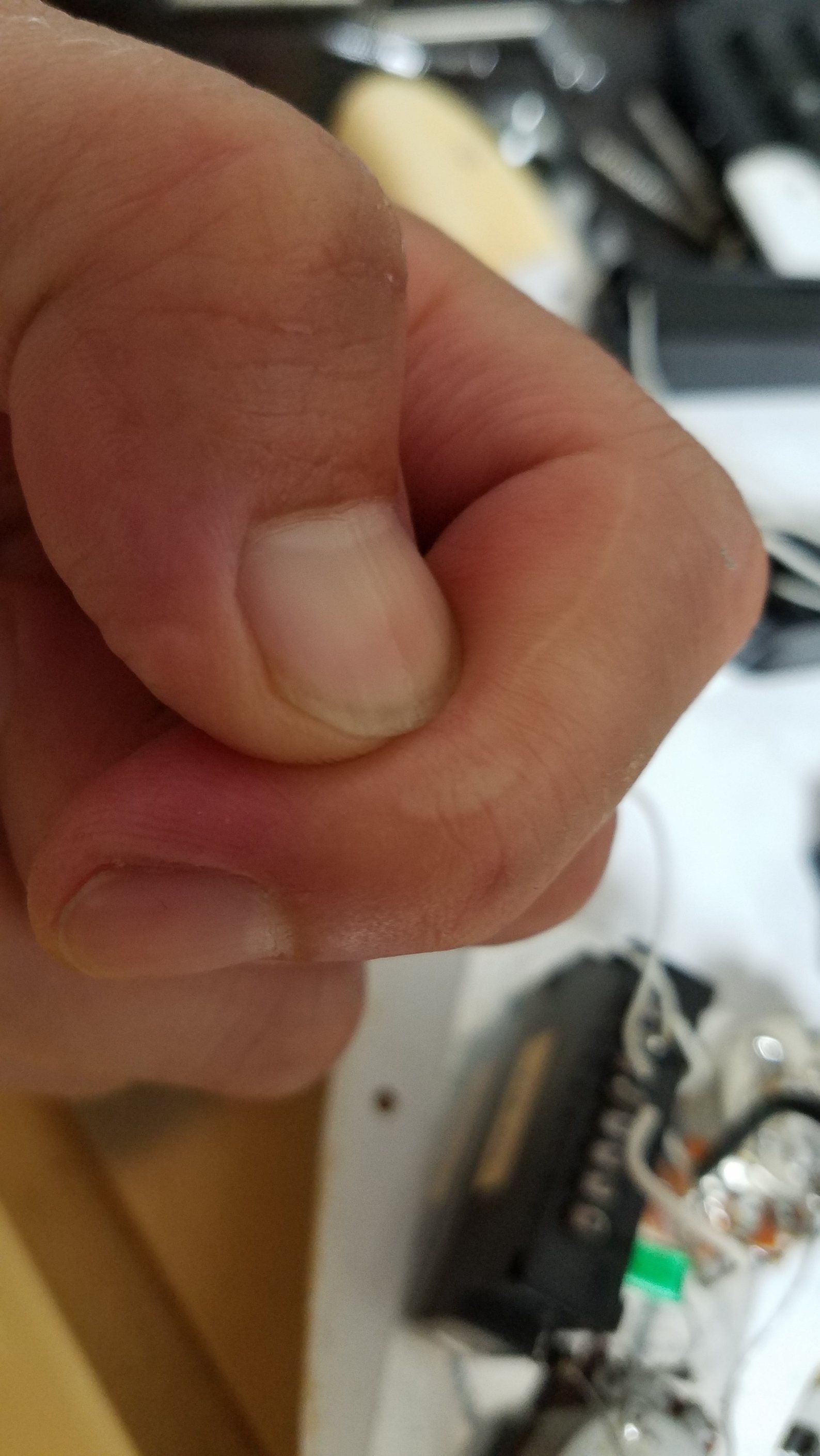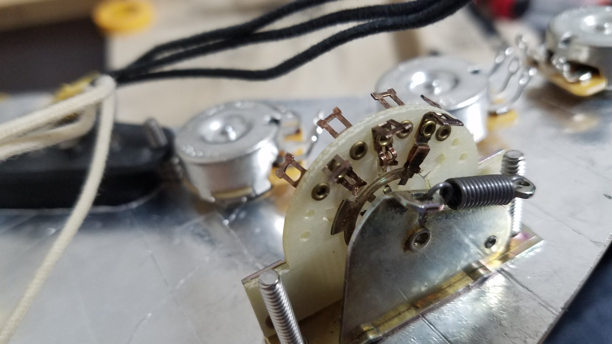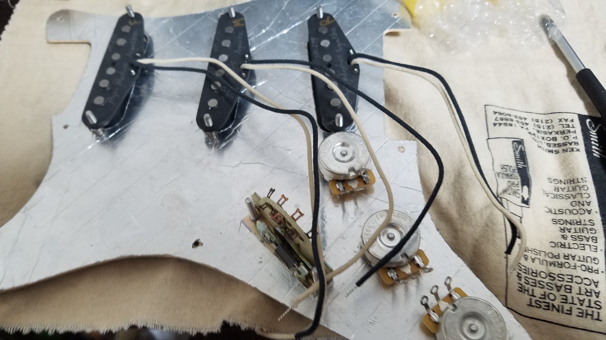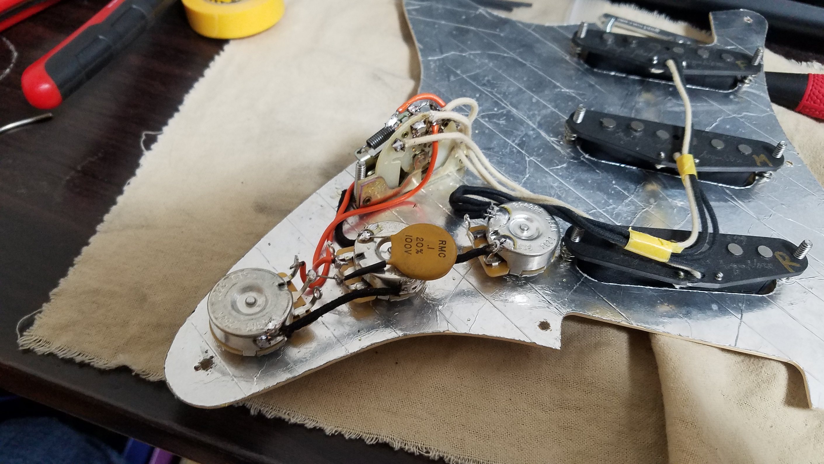 ピックガードはアイボリーの1プライだった。3トーンバーストのメイプルネック、さしずめ'58あたりの見た目になる感じか。セット販売ではなく別々に入手したネック/ボディなんだろうし、確かにネックエンドの加工が少し合わず隙間が空く。スケールラインはきちんと出たんだろうか?などと一抹の不安はある。