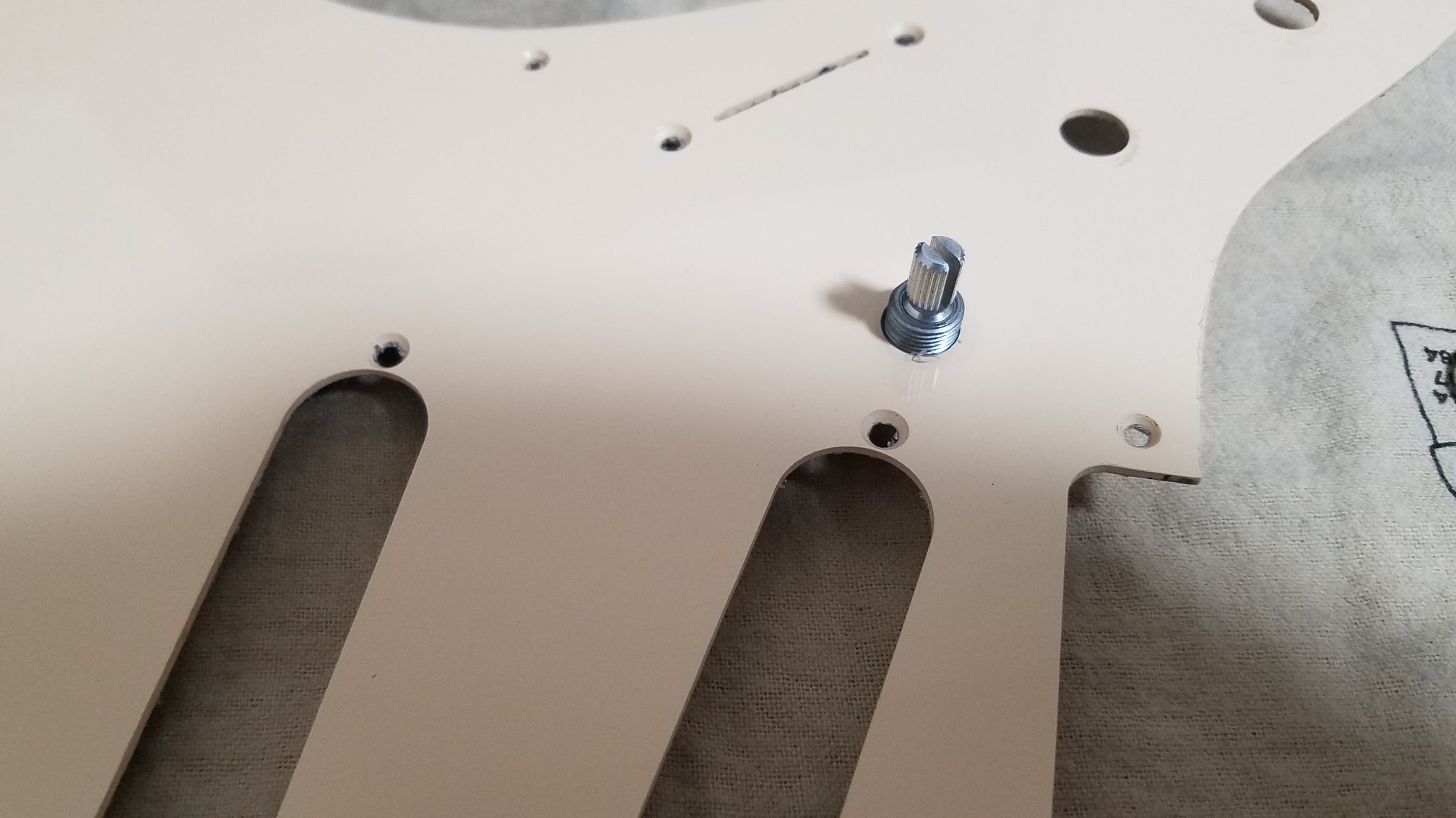 先日、白スピットファイアのネックとブリッジを仮付けした際に違和感を感じた。どうもスタッドのネジが上半分効いてない。