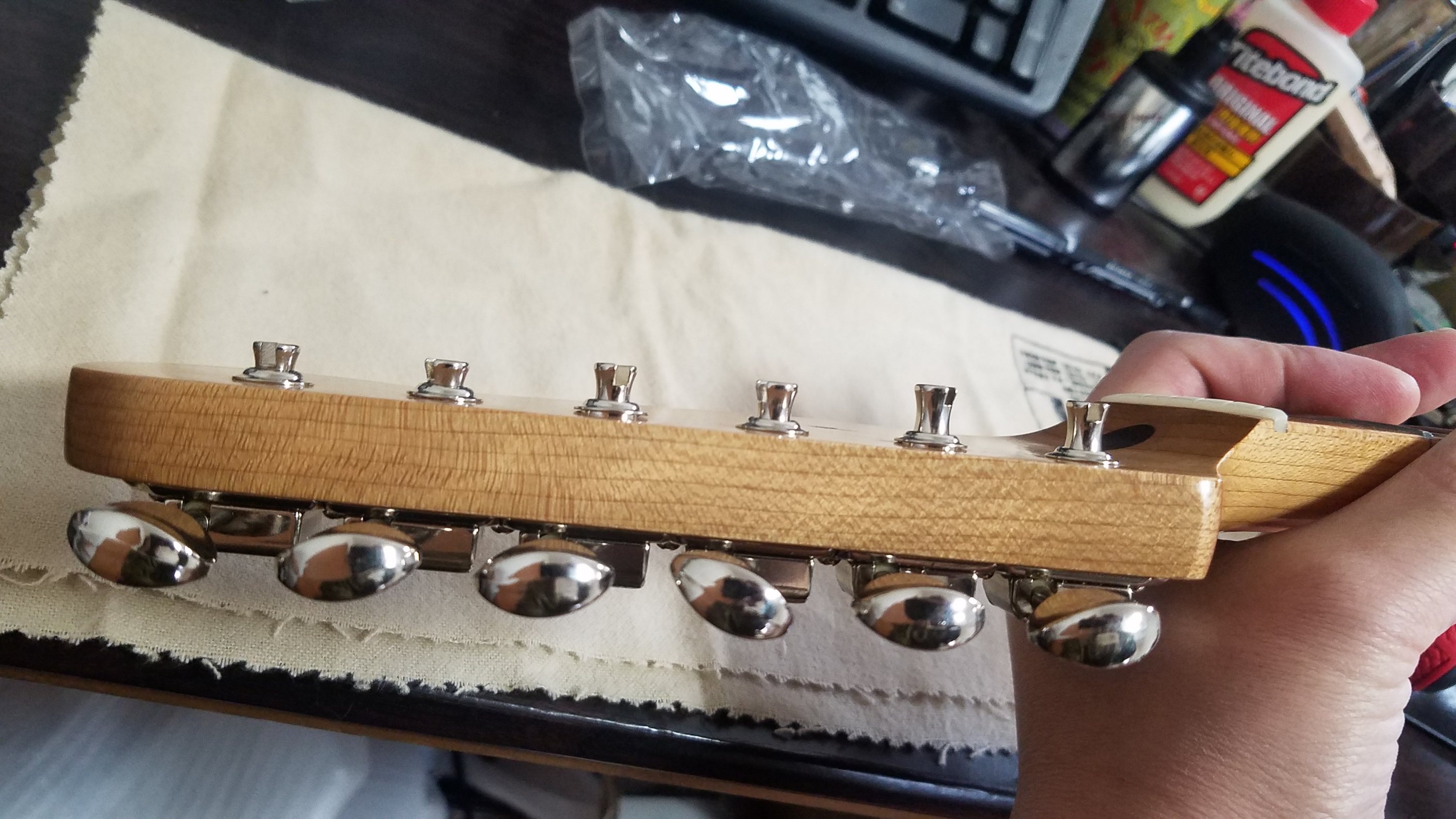 ボディネックセットなら4,000円で良いという。金物は?と訊くと全てあるそうだ。そりゃそうだよね組まれた状態で入荷したんだから。ネジ穴開け直しなんかの手間が省けるなら、その他のパーツもあれば有り難い、しばらく相談した結果、ペグ以外の金物全て付けても9,000円で良いですよ、ということになって、つい買っちまった。
